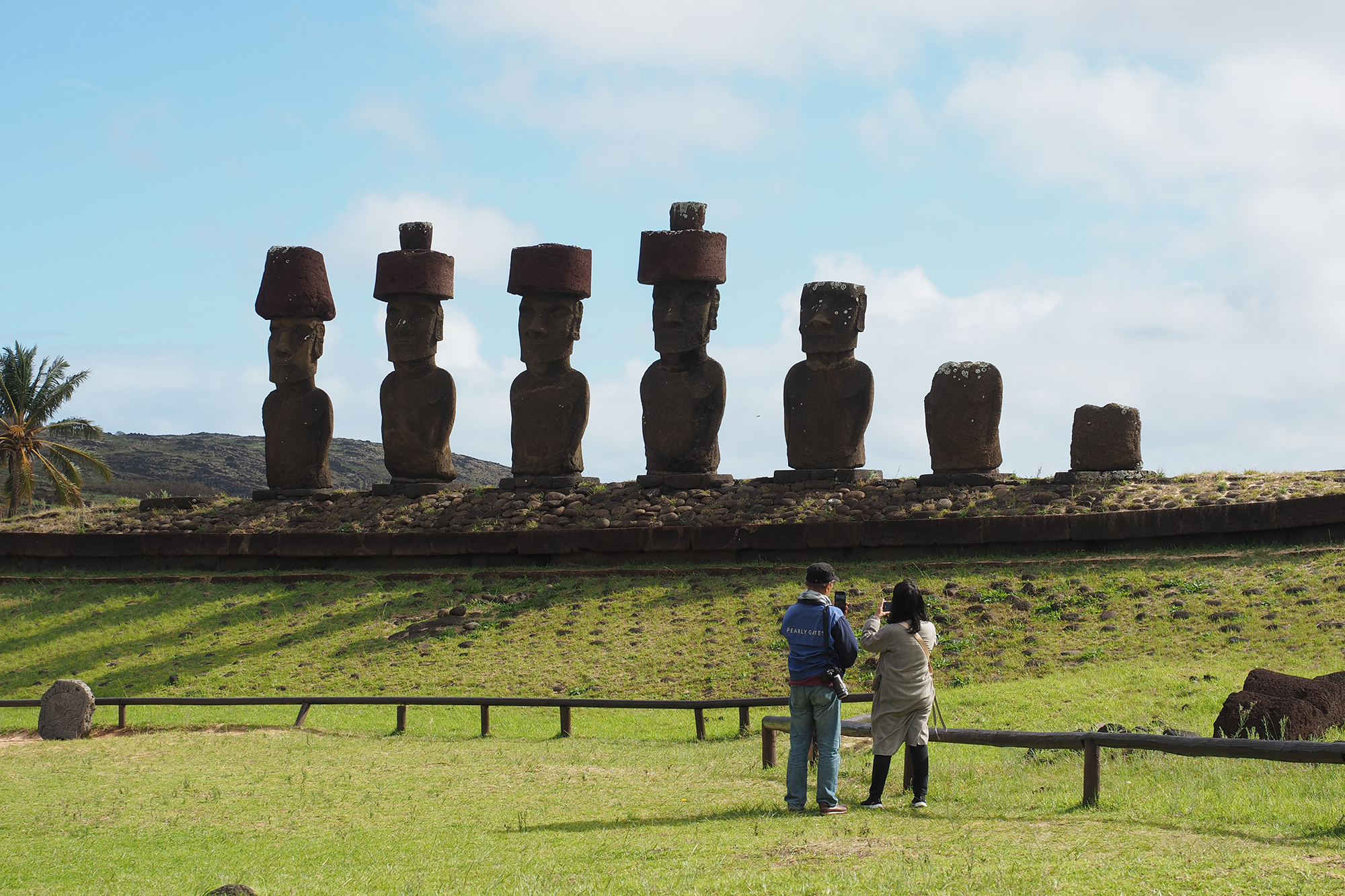 続いては、イースター島で数少ない海水浴場のアナケナ・ビーチへ。観光客はもちろん、島の人びとにも愛される綺麗なビーチは、青と白のコントラストが美しく映えます。ここは島で数少ない海水浴場であり、真っ白に輝く砂浜と美しいモアイ像を眺めることができる絶景スポットです。 このビーチに並ぶモアイ像は、「アフ・ナウナウ」と呼ばれています。長い間砂に埋もれていたため保存状態がよく、7体のうち5体は完全な形で、背中に刻まれた柄までくっきりと確認でき、頭の上の帽子とも結った髪ともいわれる「プカオ」も美しく残っています。