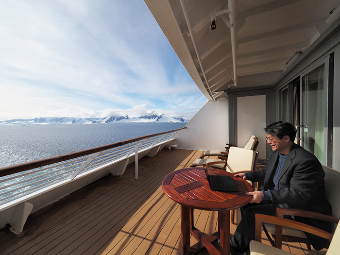 そんなことを何度か繰り返しているうちに、クジラは諦め、キャビンで執筆することにした。窓の外には雄大な氷河と山脈を抱いた南極大陸が見える。思いついてデッキにパソコンを持ち出す。稀に見る好天で、肌寒いものの日差しは温かく、快適である。 机が露で濡れていたので、タオルを敷いてパソコンを置き、おもむろにキーボードを叩き始めた。