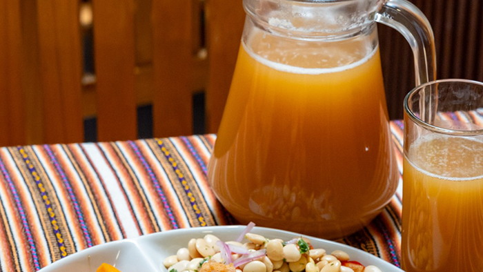 市場の中で目を引くのは、ペルーの伝統的なアルコール飲料「チチャデホラ」で、主にアンデス地方で人気があります。発酵したトウモロコシを使用した飲み物で、その歴史は非常に古く、インカ帝国時代にも飲まれていたとされています。店先で一杯、くいっとグラスを傾けると、とろみのあるやさしい甘さが口の中に広がります。飲みごたえがあり、お腹も満たされる一杯です。