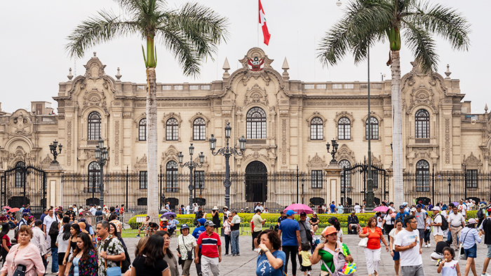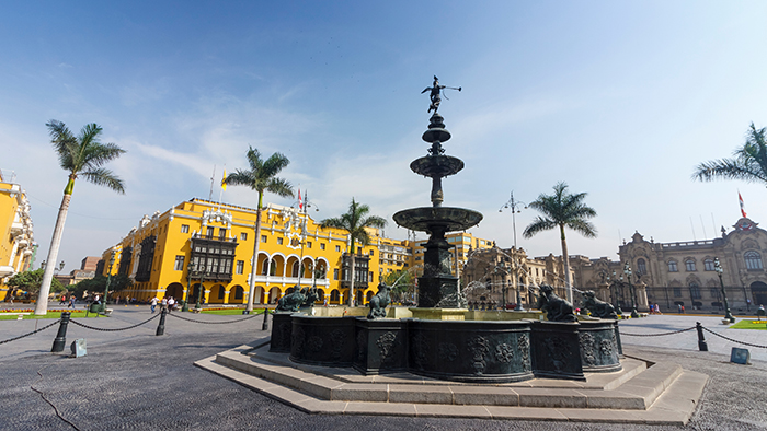 リマ旧市街の中心にあるアルマス広場は、歴史的な建造物が立ち並び、世界遺産に登録された「リマ歴史地区」の一部でもあります。スペイン統治時代に建設されたこの広場では、噴水のまわりに人びとが集まり、花壇の手入れをする職人の姿も。南米で最も古いカテドラルや大統領府、市庁舎などがあたりを囲んでいます。