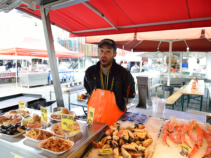 活気あふれる港周辺のエリアを散策していると、どこからともなく食欲をそそるいい香りがしてきました。あたりを見回してみると、市場を発見しました。ここは、730年以上の歴史を誇るフィッシュマーケット。新鮮なシーフードが多く揚がるベルゲンの港では、魚市場も観光スポットのひとつです。有名なノルウェーサーモンをはじめ、さまざまな魚介類や果物が並ぶマーケットは、いつもたくさんの人びとであふれ、活気ある地元の雰囲気を感じられます。手軽にその土地ならではの「食」を堪能できるのも、船旅のいいところ。