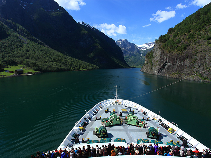 世界最狭を誇るネーロイドフィヨルド。左右に迫る急峻な山々の迫力は圧巻です。何千年、何万年という時間をかけ、壮大な景色を生み出した悠久の時の流れを思うと、人間の存在が小さく感じられ、自然の力にただただ圧倒されてしまいます。 海側からのフィヨルド遊覧を堪能したあとは、ぜひ陸側からも。世界で最も美しい鉄道の旅のひとつにも数えられる、ノルウェーのフロム鉄道から眺めるフィヨルドの景観も大変おすすめです。フィヨルドの最奥部に位置するフロムには、美しい車窓を楽しむため毎年数多くの観光客が足を運びます。