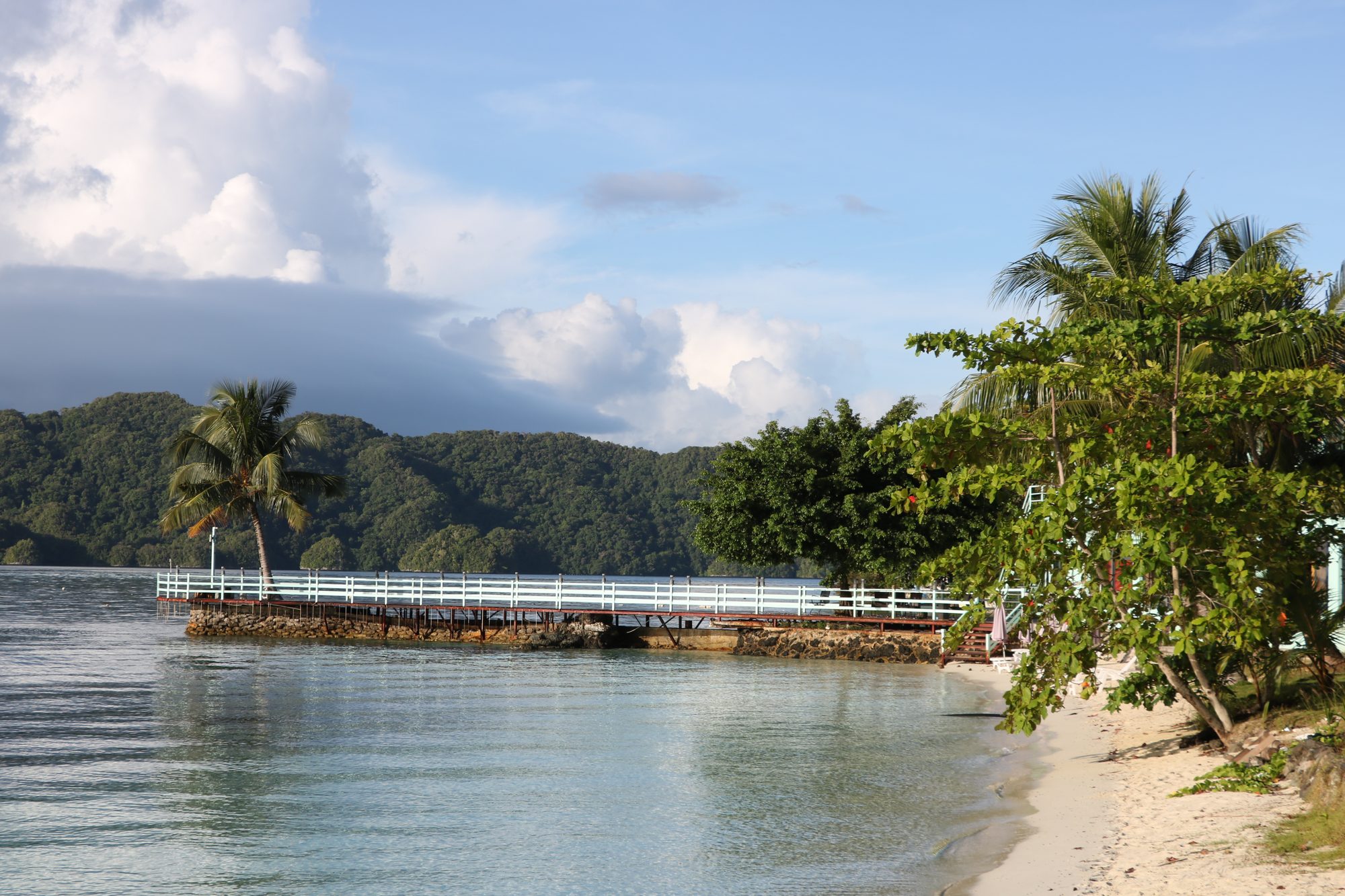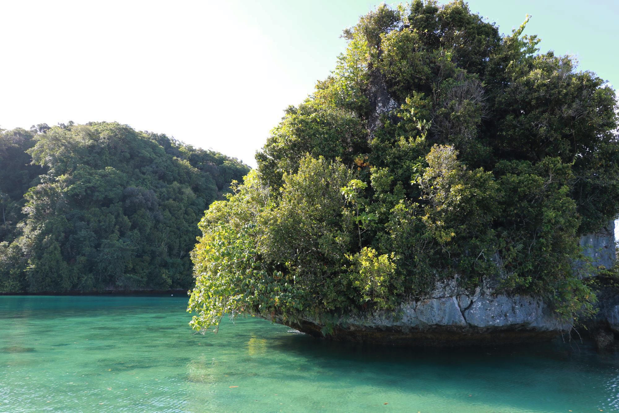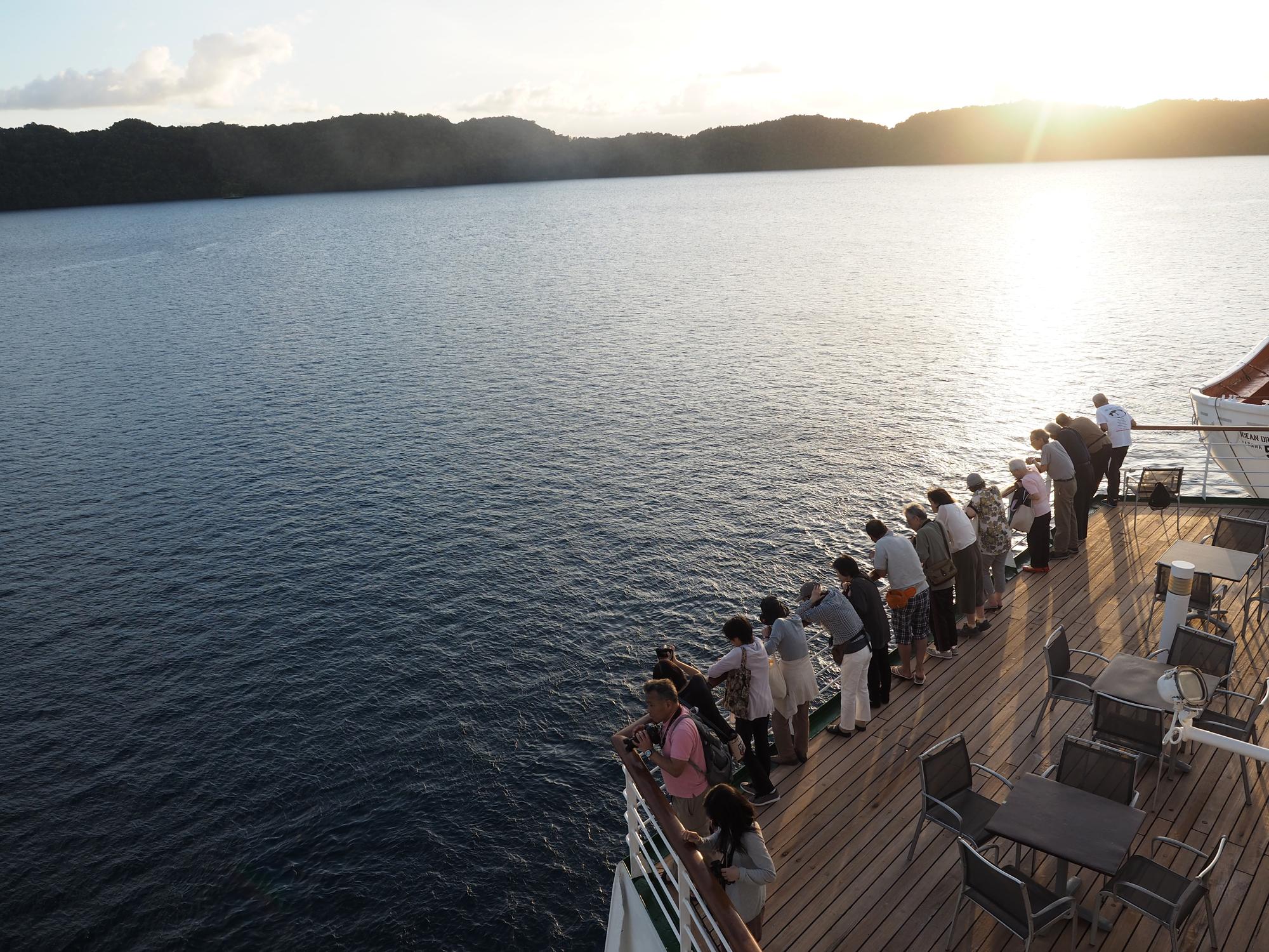 夜明け頃、船のスピードが緩やかになったタイミングでデッキへと上がると、かすかに昇りはじめた朝陽を浴びて海の中から島影が浮かんでいます。大小400余りの島々、パラオが誇る世界遺産ロックアイランドです。キノコのようなユニークな形は、石灰岩の島を数万年という途方もない時間をかけて潮流や生物が浸食したもの。数百種のサンゴや多種多様な生物が生息し、3000年前の人類の営みの跡も発見されています。静けさのなか朝陽によって次第に色を帯びてゆく島、海、空――いつの間にかデッキにはたくさんの人が集まり、言葉にできない神秘的な光景に見入ります。