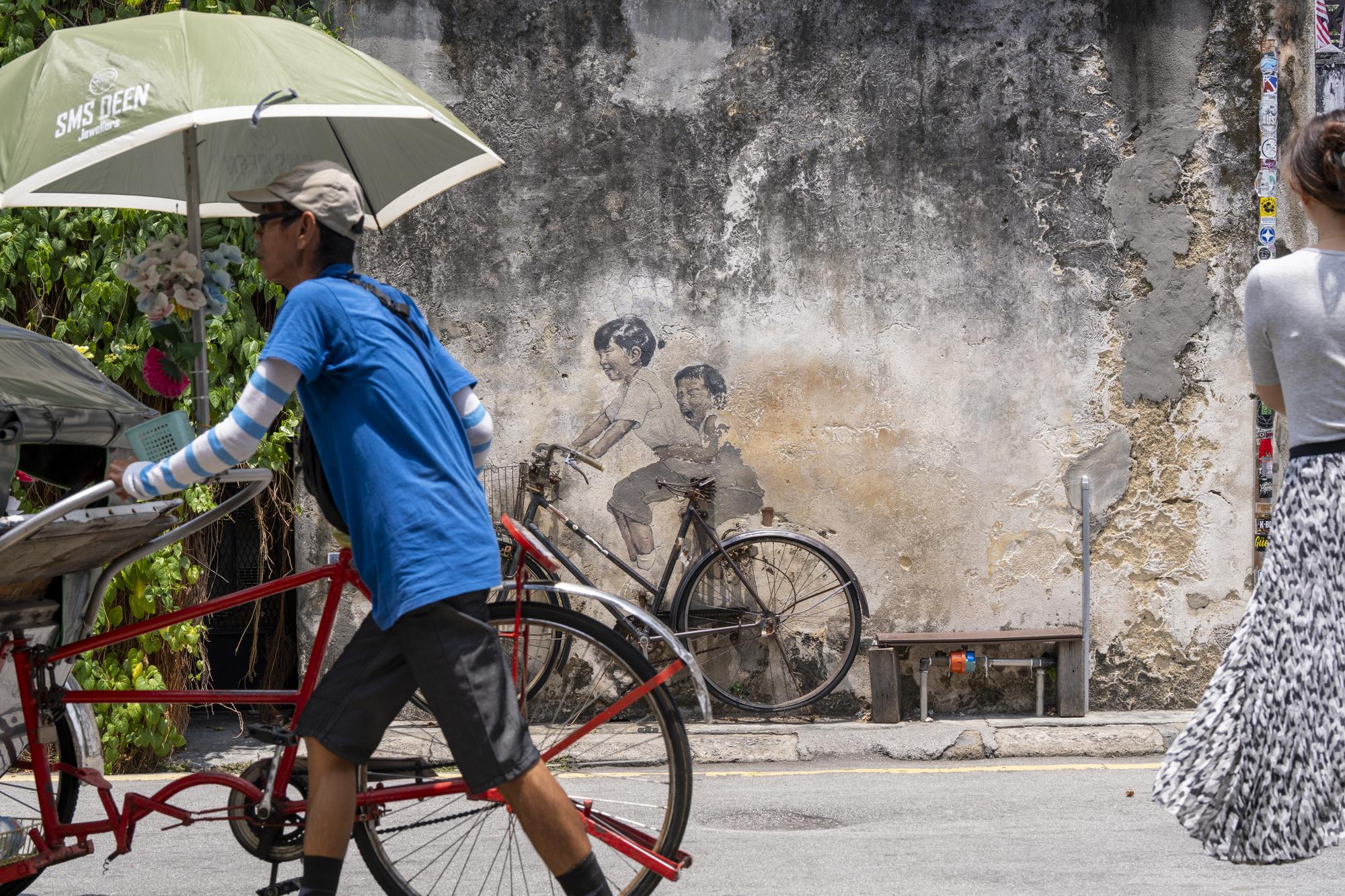 多様な文化と並んで近年注目されているのが、街に描かれた数々のグラフィックアート。リトアニア人アーティストが描いた壁画がきっかけで、現在その点数は50作品以上にもなるそうです。そんなアートを探す街歩きも、この街ならではの楽しみのひとつ。古い建物や壁に描かれた作品は、自転車に乗る子どもたちや客を待つ人力車の老人など、マレーシアの日常生活に寄り添ったものが多く、街の雰囲気にうまく溶け込んでいます。実際の自転車やバイク、イスなどと壁画が組み合わされている作品も多く、荷台や座席に座ってアート作品の一部になれるのも面白い試みです。