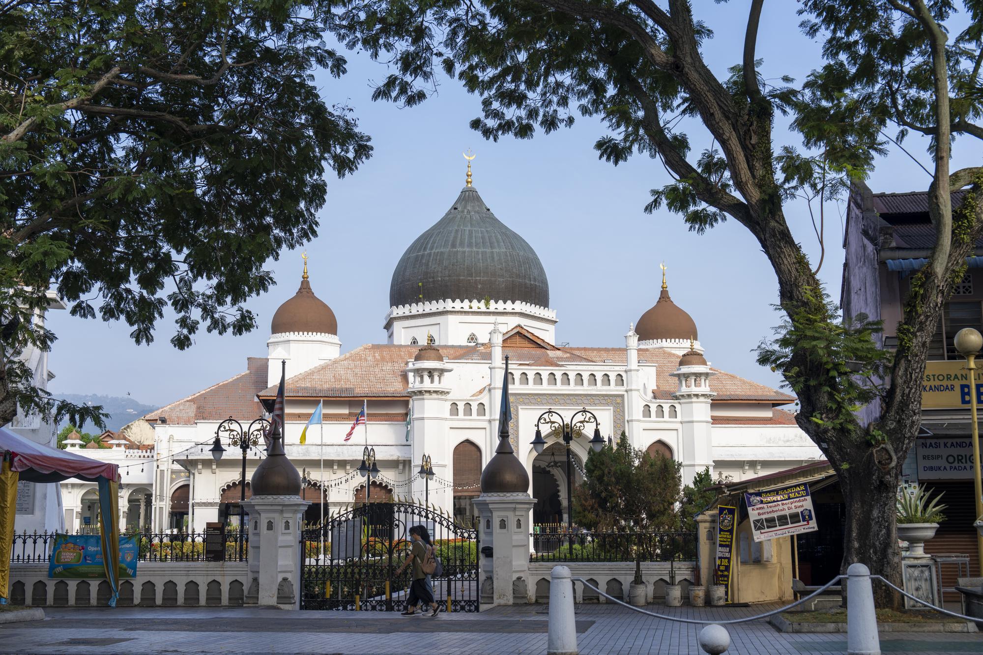 通りをさらに進むと見えてくるのは、19世紀初頭に南インドの商人によって建立されたカピタン・クリン・モスク。黒いドームと白壁のコントラストに彩られた外観はやわらかくも厳かで、ここがマレーシアで最も美しいモスクのひとつに数えられることにも納得です。