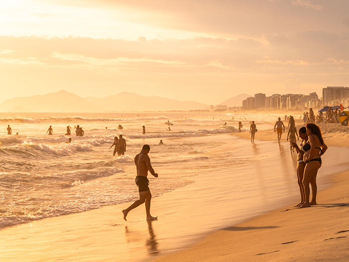リオの人びとにとって、ビーチは生活の一部。朝はジョギングやビーチサッカー、昼は友人や家族とくつろぎ、そして夕暮れになると、思い思いの場所に集まります。