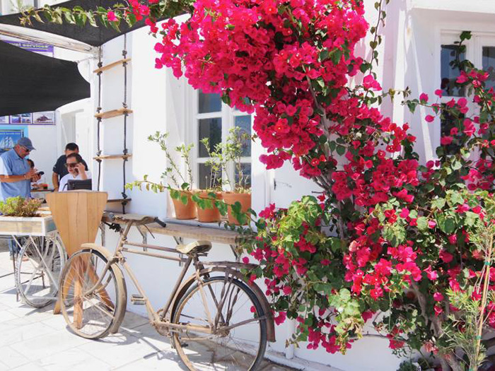 島を歩けば、海を望む絶景スポットや、風情あふれる小道が至るところに点在し、どこを切り取っても絵になる風景が広がります。白壁の建物に映えるブーゲンビリアの鮮やかなピンクが、エーゲ海の青と美しいコントラストを生み出し、街並みに華やぎを添えています。