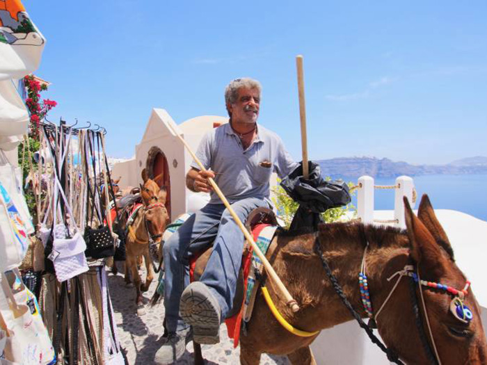 サントリーニ島へ船で到着した後は、街の中心地であるフィラへ。ロープウェイで約3分の空中散歩を楽しみながら、標高約200メートルの崖の上へと一気に上がるも良し、伝統的なロバに乗るも良し。ゆったりとしたペースで崖を登る体験は、旅の幕開けにピッタリ。階段を徒歩で登ることもできるんです。所要時間は30分ほどですが、途中で振り返ると絶景が広がり、達成感もひとしおです。