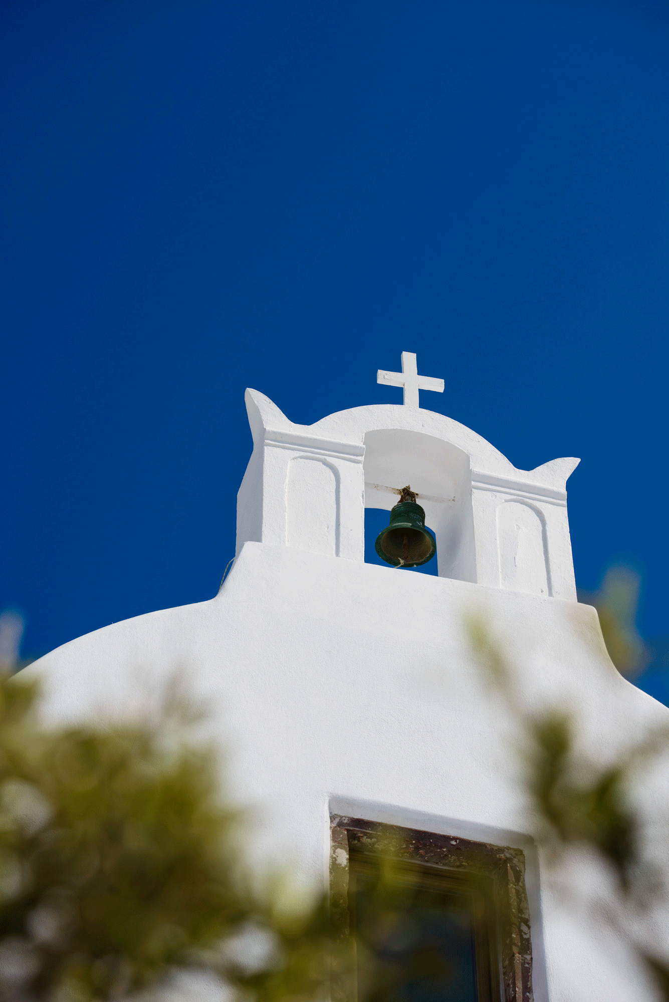 サントリーニ島の象徴ともいえる、青い屋根と白い壁の建物。そのデザインには、ただ美しいだけでなく、強い日差しを和らげる機能性や、伝統を守る島民の誇りが込められています。太陽の光を反射する白い壁が輝きを放ち、空と海の青と見事に溶け合う様子は、まるで地中海の宝石のよう。視線を上げると、空とひと続きになったかのような青いドームの教会が目に入り、サントリーニ島ならではのロマンティックな景色が広がります。
