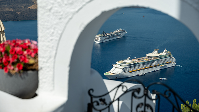 サントリーニ島には大型客船が停泊できる港がないため、上陸には「テンダーボート」という小舟を使います。ボートから島を見上げると、赤茶色の断崖の上に白壁の家々が建ち並ぶ、素晴らしい景色が広がっているのがわかります。いつもとは違う上陸方法にわくわくしながら、少しずつ近づいてくるサントリーニ島に心が躍ります。