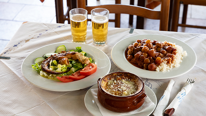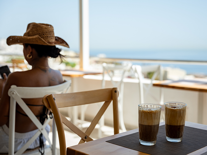 島全体が贅沢な景色で満たされているこの場所では、ほんのひとときでも特別な思い出をつくることができます。崖沿いに位置するテラス席に座り、ギリシャの伝統的なコーヒーやフレッシュなオレンジジュースを片手に、エーゲ海を眺めながらゆったりと流れる時間を感じてみてください。昼間の澄み切った青い海の輝き、夕暮れ時のオレンジ色に染まる空、そして夜には星空が広がる景色。どの時間帯でも、それぞれ異なる魅力があり、訪れるたびに新しい表情を見せてくれるでしょう。