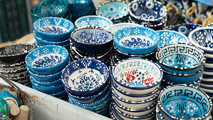 お土産を選ぶなら、ぜひ陶器にも目を向けてみてください。店先に並ぶ色とりどりの皿やボウルは、よく見るとサントリーニらしい独自のデザインが施されています。エーゲ海を思わせる深い青や、島の夕焼けのようなオレンジが絶妙に調和した色使いが特徴で、どこか素朴でありながらも力強い美しさを持っています。中には、職人が一つひとつ手作業で絵付けをした一点物もあり、棚に並ぶそんな陶器を眺めながら、どんな景色や物語が込められているのか想像する時間もまた、サントリーニならではの楽しみ方のひとつです。