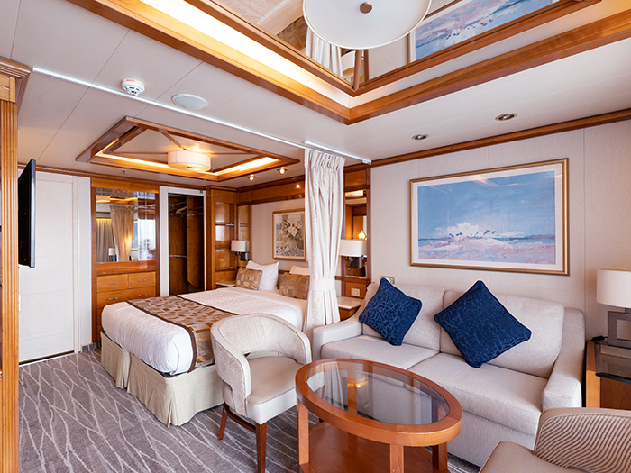 パートナーと過ごす大切な世界一周クルーズをもっと特別なものに。船室の大きな窓からは太陽の光がたっぷり差し込み、温かく開放的な空間が広がります。港から港へ進んで行く大海原に浮かぶ船上では、陸上の生活では味わうことのできない、自由な時間を過ごすことができます。広々とした船室でゆったりくつろぎながら、旅をお楽しみください。