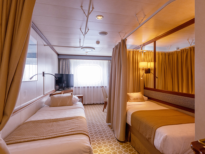 海外への長旅を、清潔感のある安心・快適な船室でご自宅のようにリラックスして過ごせるのも、クルーズならではの魅力です。さまざまなタイプの船室を豊富に備えた客船が、あなたの世界一周を豊かに彩ります。