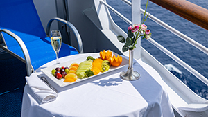 よりゆったりとした時間を過ごしたいときは、船室内電話機のルームサービスボタンを押すだけで、24時間いつでも簡単にルームサービスをご利用いただけます。