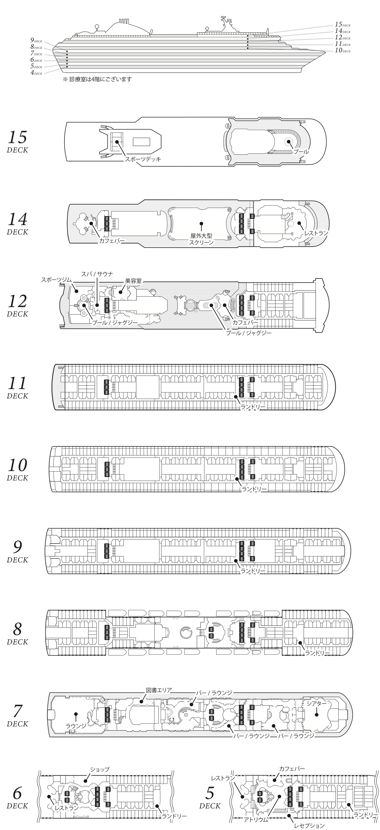 2つのプールと3つのジャグジーを備えたプールデッキでは、日光浴をお楽しみいただけます。プールサイドには、320インチの巨大LEDスクリーンも。そのほか広々としたショーラウンジなど、各所で極上のひとときをお過ごしください。