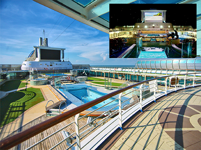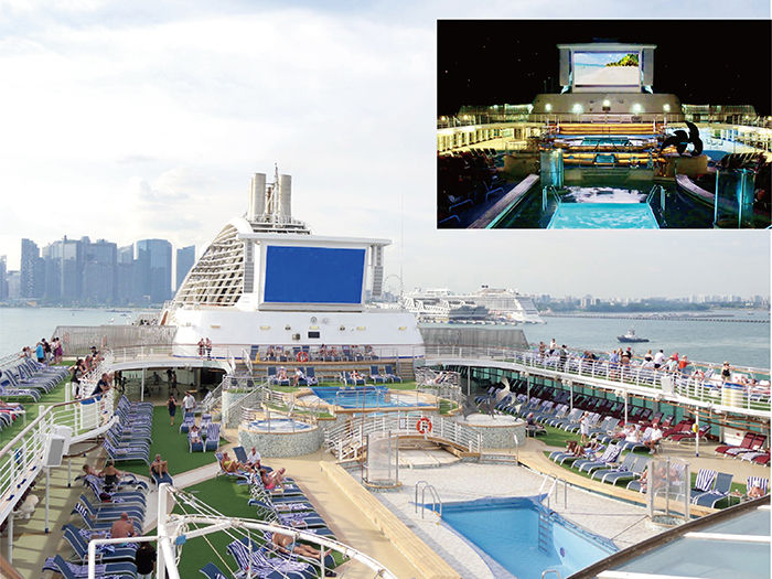 エンターテインメント施設も充実しており、音響・照明設備が整った大型シアターやラウンジでは、連日さまざまな企画が行われます。約320インチの巨大LEDスクリーンを備えた屋外シアターでは、日中は太陽の下、夜は満点の星空の下、波の音をBGMに、ゆったりとした名作映画の数々をご鑑賞ください。洋上には「好きなことを好きなだけ」という過ごし方ができる、唯一無二の空間が広がっています