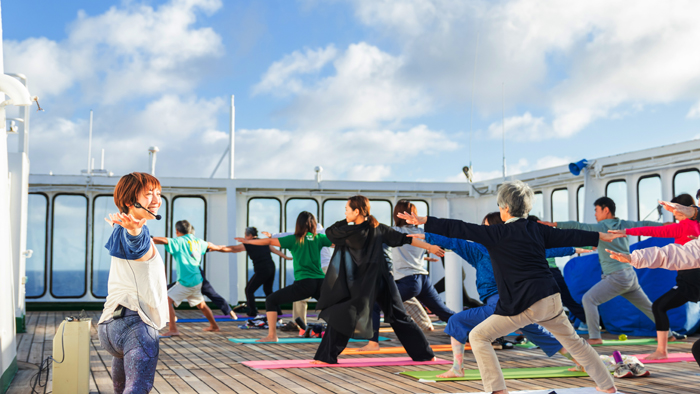 寄港地では、パタゴニアの大地をトレッキングしたり、マングローブの森の中をボートで遊覧したりと、世界各地の雄大な自然をアクティブに楽しむさまざまなオプショナルツアーを実施します。船内では、身体を動かすプログラムも充実しています。
