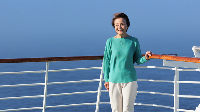 これまでの船は1000人も乗ったらいっぱいというイメージがありました。でもパシフィック・ワールド号は船自体が大きいし、空間にも余裕がある。だから、窮屈感はないですよね。特にアトリウムの吹き抜けは開放感がありますね。船室でも同じ部屋の方とずっと一緒にいるわけではないので、こうやって公共のスペースがたくさんあって充実しているのはいいと思います。それから食事がおいしいのがうれしいですね。日本人総料理長がいらっしゃいますし、時々あんこ系のお饅頭なんかが出ると個人的にはとても盛り上がります(笑)