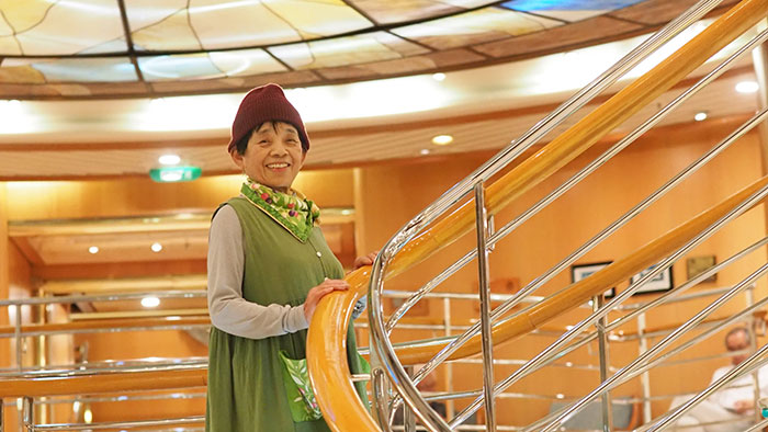 昨年主人を病気で亡くし、その後はやっぱり寂しさが出てきてずっと涙ぐむような日々でした。そんなときに新聞でピースボートクルーズの広告を目にしました。実は40年ほど前に、小さな駅でよくポスターを見ており、「どんな旅だろう、いつか行きたいな」と思いをめぐらせていました。ただ、3か月となると仕事も休めないなと当時は考えていたので、今回広告を見たとき思い切って電話をしてみました。そうしたら名古屋で説明会があると聞いたので、行ってみたんです。説明会では最初は北欧航路に惹かれましたが、いろいろなタイミングを考慮して今回のクルーズに申し込むことを決めました。
