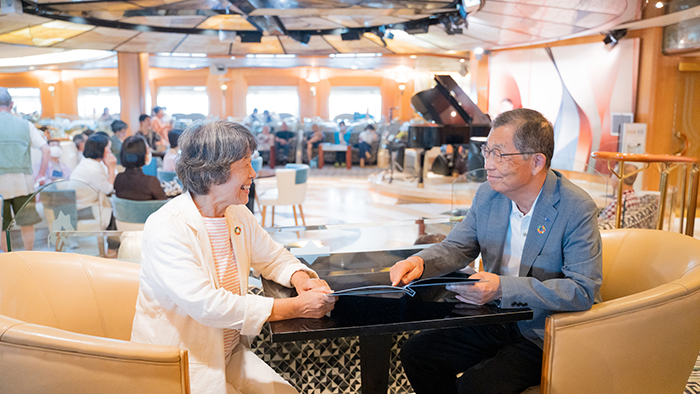 千栄子さん:20年以上前に新聞の広告欄で「地球一周の船旅」というのを見て、一回行ってみたいと思っていたんです。まったくの夢でしたけど。/ 英伸さん:私は機械の製造メーカーに勤めていました。妻に誘われた当時はとにかく仕事人間で、昼も夜もなかった。だから「そんなんできるわけないよ」と思っていたんですよ。でも退職を機にピースボートを思い出し、船旅説明会に参加して話を聞き、それで帰り際に一番早く参加できるクルーズに申し込みました。自分へのご褒美と、家族家庭を支えてくれた妻への感謝の気持ちですね。