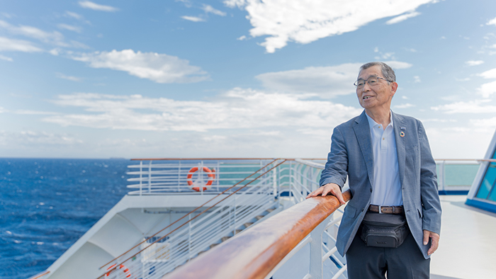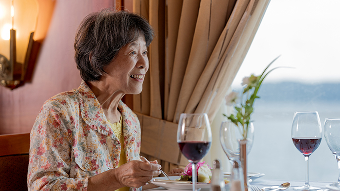 英伸さん:やっぱり360度水平線という海の真ん中にいて、ずっと海を見ることができた。3食付きで、自由気ままにのんびりできますよね。/ 千栄子さん:船に乗ると食事の支度もしなくていいじゃないですか。自由に見るところを見て、楽しむところを楽しみ、そしてお食事は何もしないでもおいしく頂ける。もうこんなにいいことはなかったですね。そして食事もおいしかったですよ。私も海が大好きだからそう飽きることはなかったですね。