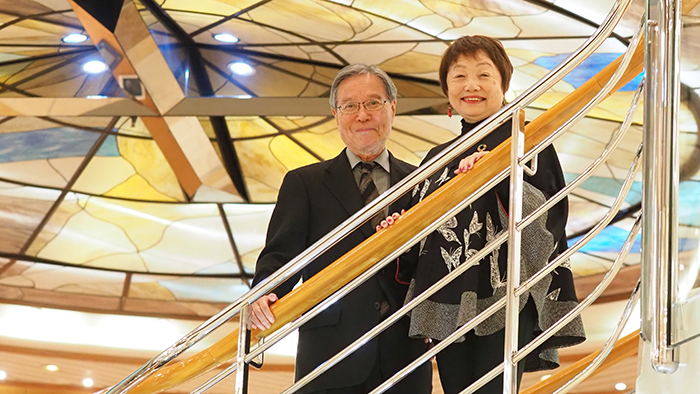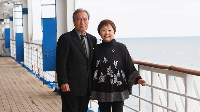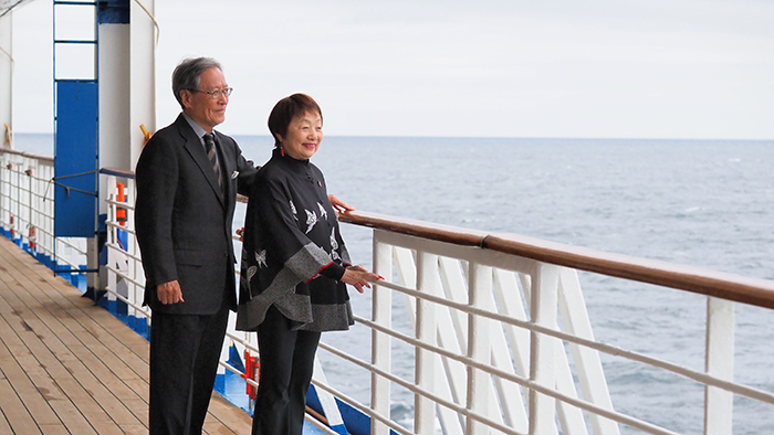 健さん:やっぱりこの船のクルー、スタッフなど皆さんとても親切で、それがとてもよかったです。船室や船内もクリーンですし、何かあっても対応も非常にスムーズにやっていただけるので感謝しています。/道子さん:私たちは今、80代の青春をどう過ごそうかと船に乗っていますが、2人でずっと一緒にいられることはすごく貴重なことですね。上げ膳据え膳ですし、お友だちもいるし、お掃除もしてくれる。何もしなくていいので、この貴重な時間を2人で楽しんでいます。若い人だけじゃなく、年齢に関係なくいろんな方にこの船に乗ってほしいですし、夢をもって行動してほしいなと思いますね。
