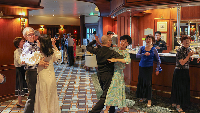 道子さん:今回、乗船前から「何か記念になることをしたい」と思っていたので、2人で“80の手習い”として社交ダンスに挑戦したんです。/健さん:最初は渋々でしたけどね。多いときは毎日2、3回レッスンがあるので、自主練習で一緒になった友人に教えてもらいながら、発表会に向けてがんばりました。/道子さん:乗船してから和太鼓もできると知って、昔父が好きで私も幼少期にやっていたのでやってみることにしました。発表会にも出たんですが、見ていた方から「あの真剣な顔を見ていたら涙が出た」と聞いて、すごくうれしかったですね。力いっぱいやるので、とても気持ちがいいんですよ。