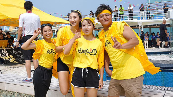 船内イベントで運動会をやるにあたり、黄色チームの団長をしたんです。1チーム400人もいて、年齢も国籍も違う人たちをひとつのチームにしていくのは大変でしたね。団長なんて立場は初めてだったのでプレッシャーもあったし、みんなが楽しむにはどうしたらいいかと常に考えてました。頼ることが苦手だったけど、周りに相談して頼ってみることも大事だと気づいてからは、逆にその方がみんな一緒に楽しくやれると感じ始めました。団長は私だけど、みんなで創り上げていく経験ができてよかったなと思います。全部自分でやらなくていい、助けてもらうこと、頼ることも大事だと気づきましたね。