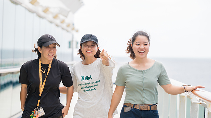 船内でいつも一緒に過ごしていた人たちは、私よりも少し年上の人たちが多く、大学での友人関係とも違う、普段は関わらない人たちと一緒に海を見ながらごはんを食べたり楽しいことをする時間が好きでした。その人たちは、日常の中で自分たちでどう楽しむかを考えて、全力で楽しんでいて。運動会なんかで大変なときには「助けようか?」と言ってくれたのも、その方たちでした。そういう場面での気配りとか、こちらが言う前に動いてくれてサポートしてくれるところに支えられました。