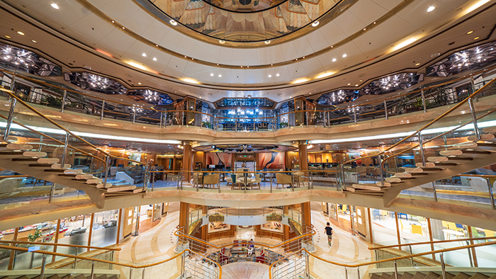 今回船が変わりましたが、アトリウムが本当にきれいで。建設関係の仕事をしていたので、アトリウムの凝った艤装にとても感心しました。あと驚いたのはレジェンドバーとホイールハウスバー。これは日本の一流ホテルと同じ艤装だなと思いました。さすがイタリアで造船された船ですね。あとは船内のWi-Fi環境がよくなったと思います。乗船してから寄港地で使用するレンタカーと宿の予約の手配をしたのですが、スムーズに予約することができました。