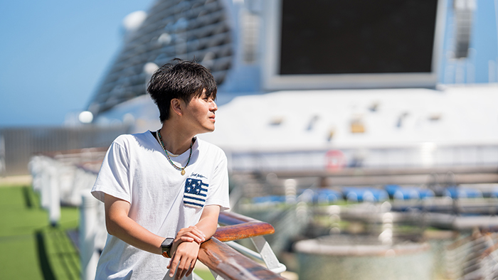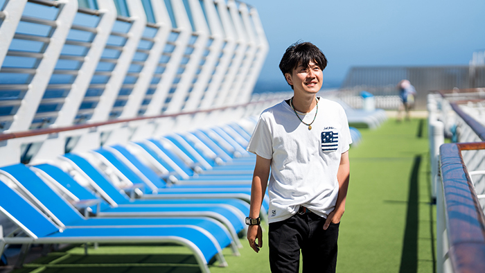 乗船前は介護福祉士をしていましたが、次にやりたいことがあるので、退職をしてからその間に世界一周をしてみたいなと思っていたんです。自分のためになりそうだと思ったし、たくさんの人との出会いの中で、次に一歩踏み出すときのコミュニケーションなどを学べるんじゃないかと。船では「ワイヤー」というニックネームで呼ばれています。趣味がDIYなんですが、その話をしたらなぜかそんなニックネームに(笑)。でも意外と気に入っていて、それを機にSNSのアカウントも変えたくらいです。